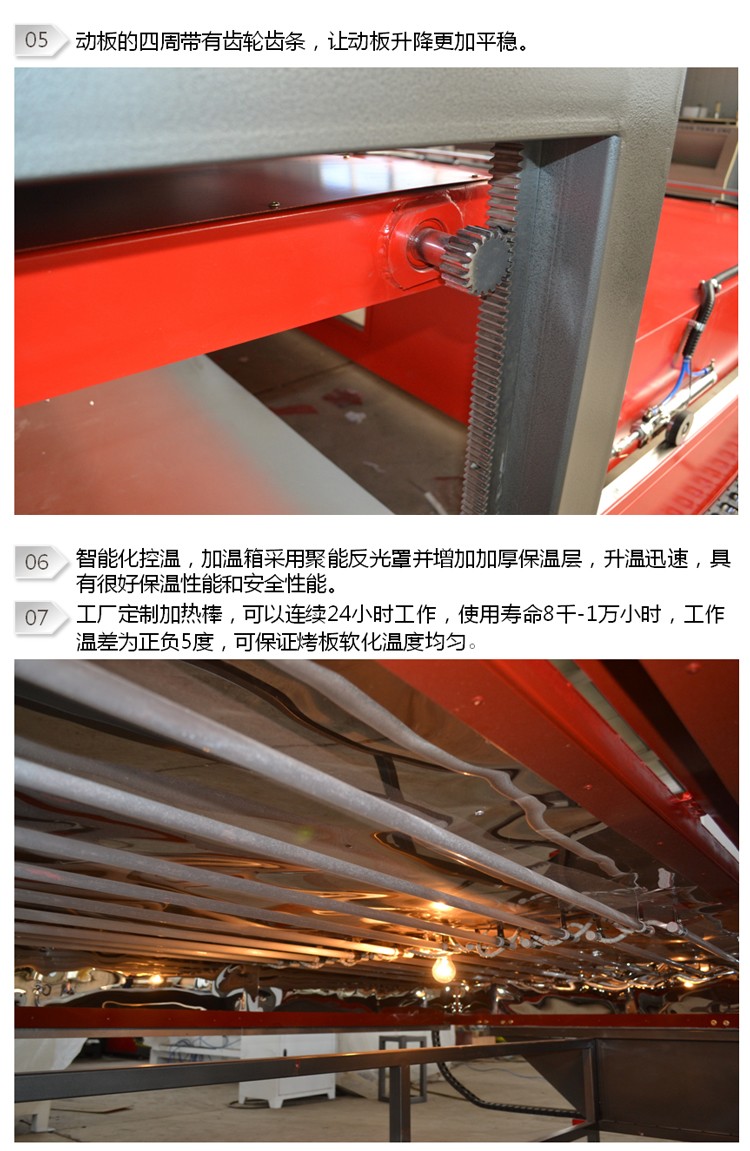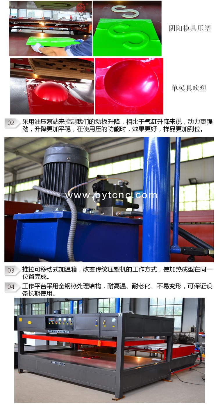3.推拉可移動式加溫箱,改變傳統壓塑機的工作方式,使加熱成型在同一位置完成。